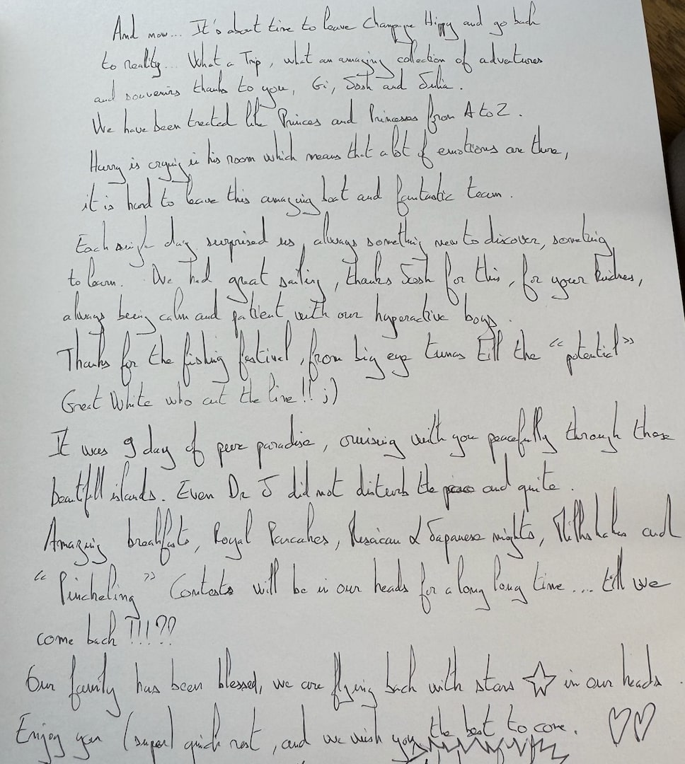 We have been treated like princes and princesses from A to Z. Harry is crying in his room which means that a lot of emotions are there, it is hard to leave this amazing boat and fantastic team.