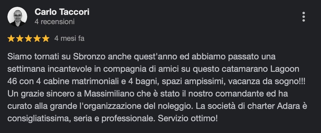 A sincere thanks to Massimiliano who was our commander and took care of the organization of the rental. The charter company Adara is highly recommended, serious and professional. Great service!