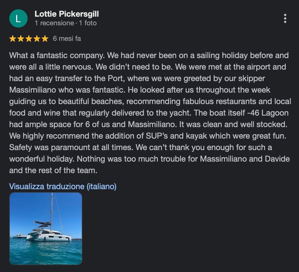 What a fantastic company. We had never been on a sailing holiday before and were all a little nervous. We didn’t need to be. We were met at the airport and had an easy transfer to the Port, where we were greeted by our skipper Massimiliano who was fantastic. He looked after us throughout the week guiding us to beautiful beaches, recommending fabulous restaurants and local food and wine that regularly delivered to the yacht. The boat itself -46 Lagoon had ample space for 6 of us and Massimiliano. It was clean and well stocked. We highly recommend the addition of SUP’s and kayak which were great fun. Safety was paramount at all times. We can’t thank you enough for such a wonderful holiday. Nothing was too much trouble for Massimiliano and Davide and the rest of the team.