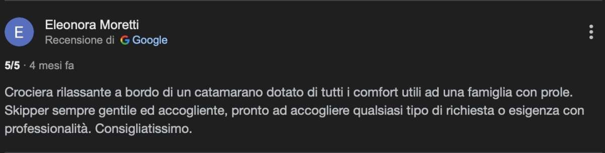 Relaxing cruise aboard a catamaran equipped with all the comforts useful to a family with offspring. Skipper always kind and welcoming, ready to welcome any type of request or need with professionalism. Highly recommended.